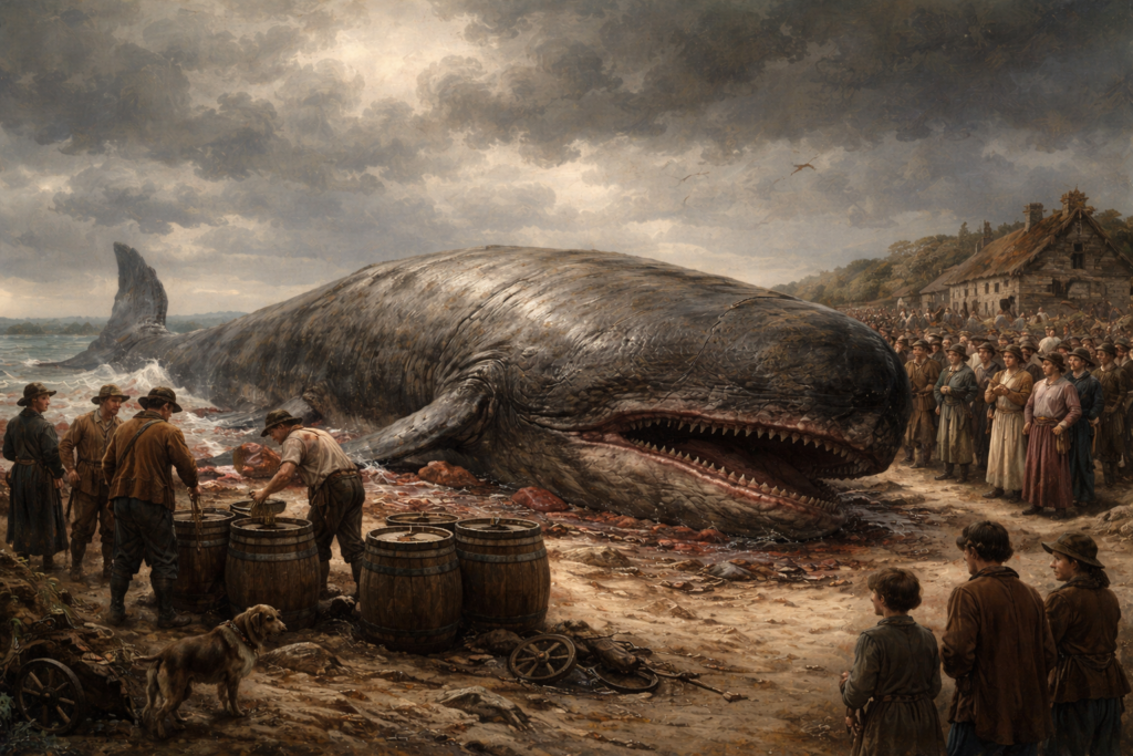 La créature, longue de quarante-neuf pieds et dotée de trente-quatre grosses dents, suscite l’étonnement. Vendue pour 130 francs, elle permet d’extraire quatre-vingts barils d’huile. L’événement frappe les esprits et alimente longtemps les récits locaux.