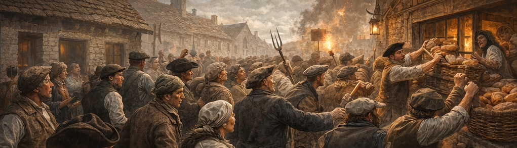 Un exemple significatif de ce climat de tension est la “Guerre des farines” de 1775 : une série de révoltes populaires en France, déclenchées par la flambée des prix des céréales et du pain dans tout le royaume, alimentée par des mauvaises récoltes des années précédentes et des modifications de la réglementation sur le commerce des grains. Ces événements illustrent combien le pain — aliment fondamental — pouvait devenir le point de rupture sociale dans les villes et villages.