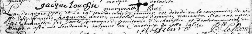 « L’an de grace 1701 et le 19e jour du mois de janvier est decedé en la communion de nre [notre] Ste Eglize françois hagneray ancien matelot aagé d’environ nonante six ans apres avoir esté administré des saints sacrements de penitence d’Eucharistie et d’extremonction dont le corps a esté le lendemain inhumé au cimetiere de cette Eglise. »