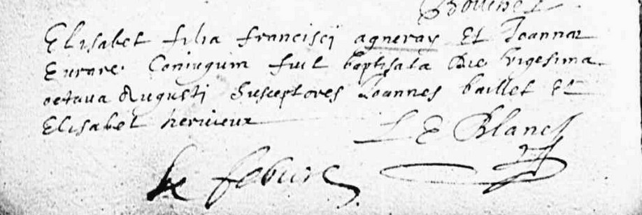- 1667 : Baptême de sa fille Élisabeth, ayant pour parrain Jean Baillet, membre présumé de sa famille maternelle étaploise.