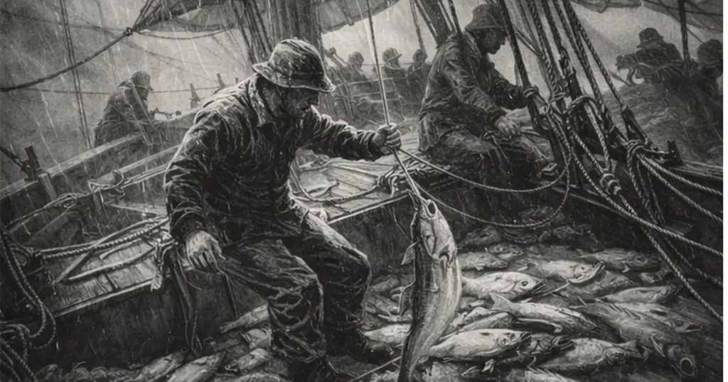 La grande pêche expose les marins à des conditions particulièrement éprouvantes : longues traversées, froid, brouillards, tempêtes, isolement et risques constants d’accidents. Les pertes en mer marquent durablement les mémoires collectives.