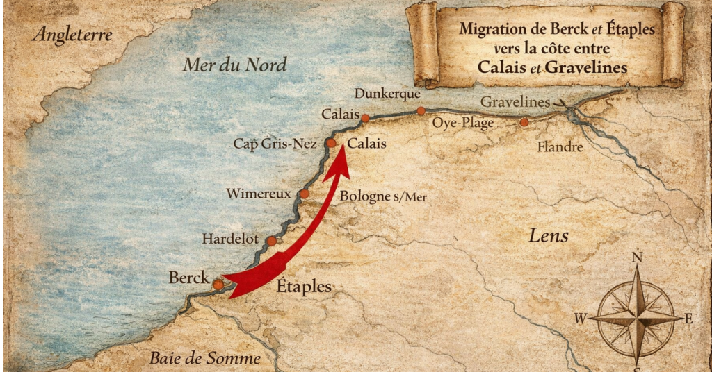 Ils s’établissent le long du rivage entre Calais et Gravelines, à proximité immédiate de la mer, privilégiant l’accès direct aux zones de pêche plutôt que l’arrière-pays agricole. Cette implantation marque le véritable point de départ du peuplement littoral structuré dans cette partie du Calaisis.