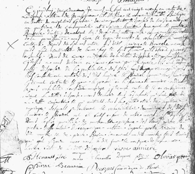 Alors qu’il est marié à Marie BRUXELLES depuis déjà dix-sept ans, le couple doit soudainement faire face à un imbroglio juridique et religieux. La découverte d’un lien de consanguinité jusqu’alors ignoré menace la légitimité de leur nombreuse descendance. Cet acte de réhabilitation, obtenu après une dispense de l’Évêque de Boulogne, est un témoignage rare de la « bonne foi » des époux et des stratégies familiales mises en œuvre pour protéger l’héritage et l’honneur d’une lignée.